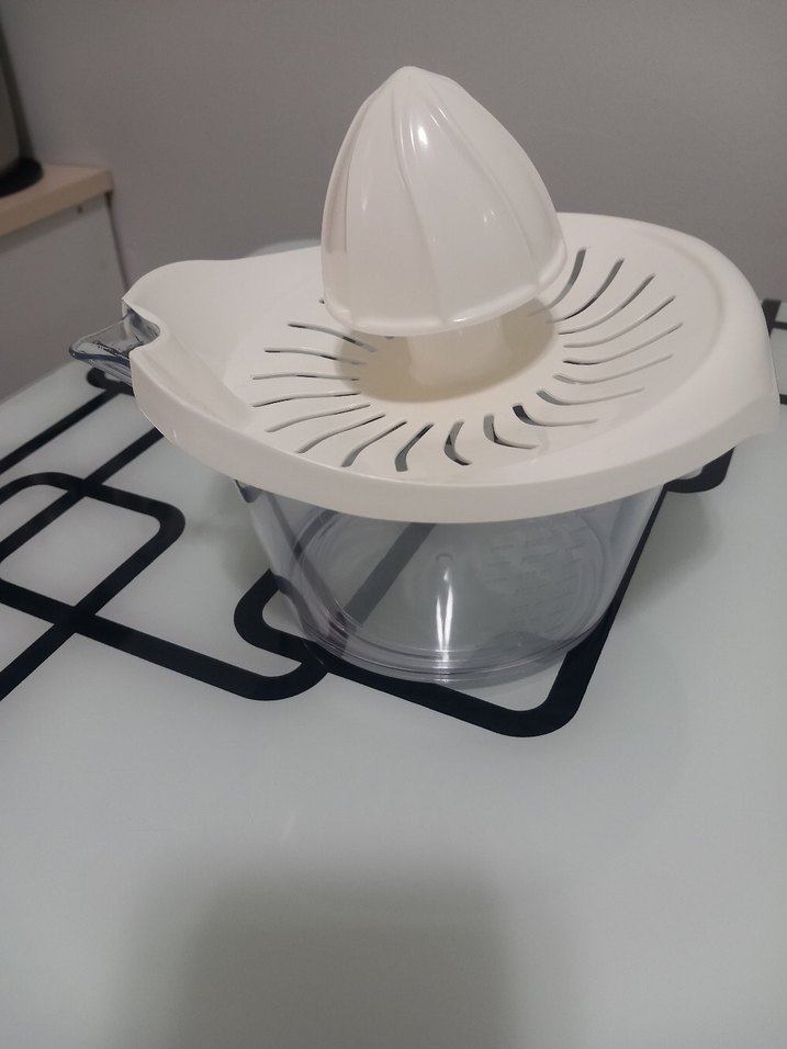 Beyaz üst kısmı ve gri haznesi olan meyve sıkacağı, kolay portakal suyu çıkarma için tasarlanmıştır. Kabartmalı sıkma başlığı ve şeffaf hazneye sahiptir.