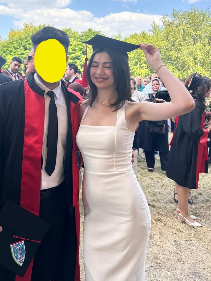 Beyaz, parlak kumaştan, askılı ve drapeli detaylı, vücuda oturan midi boy mezuniyet elbisesi. Minimalist ve şık tasarım, düğün ve mezuniyet için uygun.