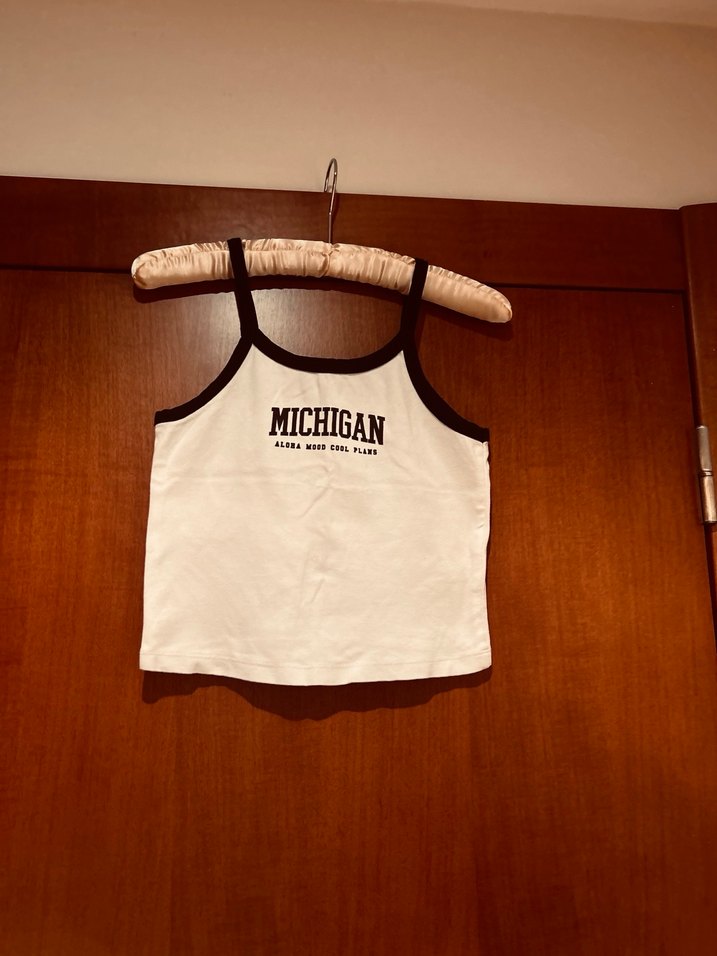Pamuklu, beyaz Michigan baskılı, straplez, normal boy, fitted crop. Rahat ve şık göbek deliğinin tam üstünde kalıyor.
