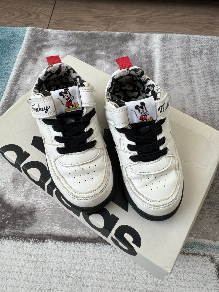 Beyaz renkte, Mickey baskılı, cırt cırtlı ve kauçuk tabanlı erkek çocuk spor ayakkabısı, rahat sokak stili için uygundur.