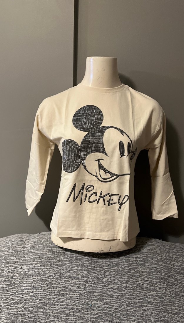 Yumuşak pamuklu, bol kesim beyaz uzun kollu kız tişörtü, parlak Mickey baskılı ve düğmeli detaylara sahip.