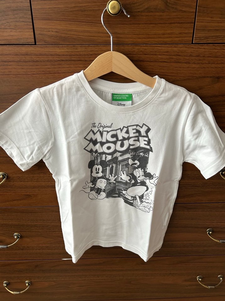 Pamuklu beyaz erkek tişört, kısa kollu ve yuvarlak yaka. Gri Mickey Mouse baskısıyla rahat ve bol kesim, sokak stiline rock punk havası katıyor.