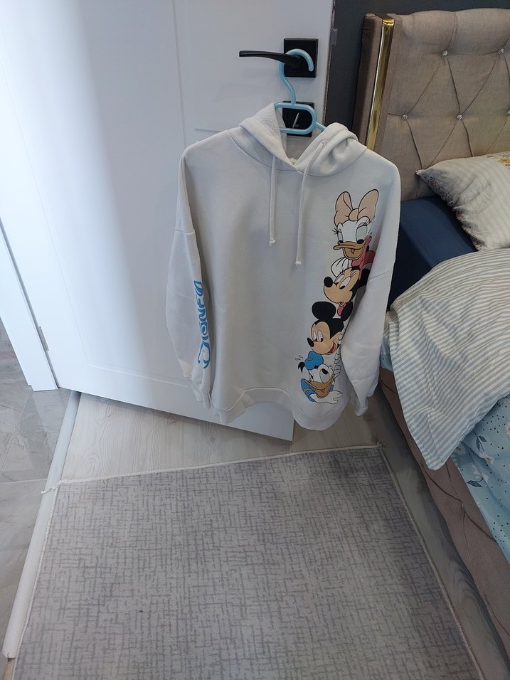 Pamuklu, uzun kollu, bol kesim beyaz sweatshirt. Mickey Mouse baskısı ve düğme detaylarıyla günlük sokak stiline uygun.