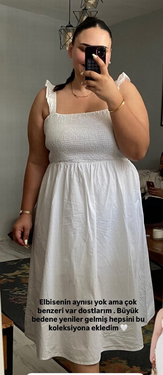Beyaz midi elbisesi, kayık yaka ve askılıdır. Pamuklu, bol kesim ve pileli detaylara sahiptir, bohem ve minimalist tarzda rahat bir seçenektir. Esnek deodorant kaynaklı sararma mevcut koltuk altı bölgesinde