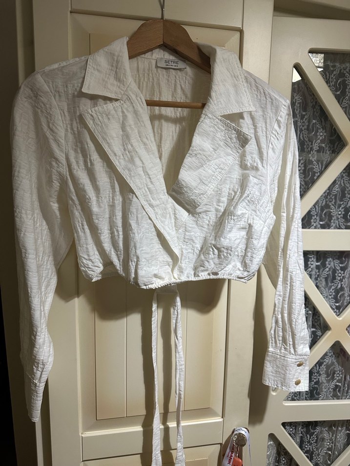 Beyaz gömlek, kesik yakalı ve düğmeli. kollu,günlük sokak stili için uygun. Kotlar ve etekler ile harika duruyor.1Kere giydim.