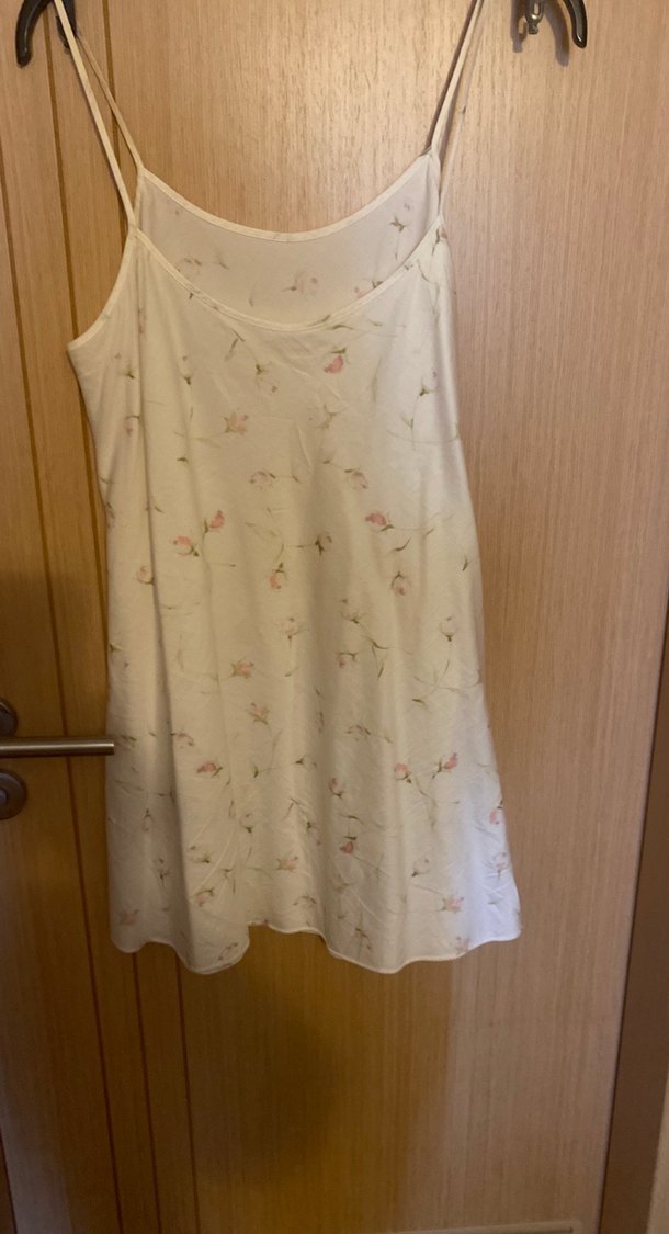 Beyaz midi boy, ince askılı, bol kesim ve pastel çiçek desenli, minimal bohem tarzda gece elbisesi.