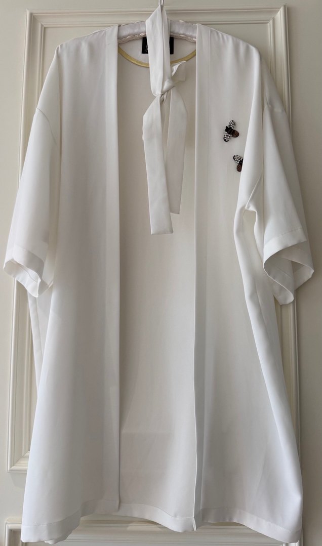 Beyaz ve bol kesim bir abayadır. Notlu yaka ve midi boyda, sade tasarıma küçük kelebek detayları eşlik eder. Seyyar kemerlidir.