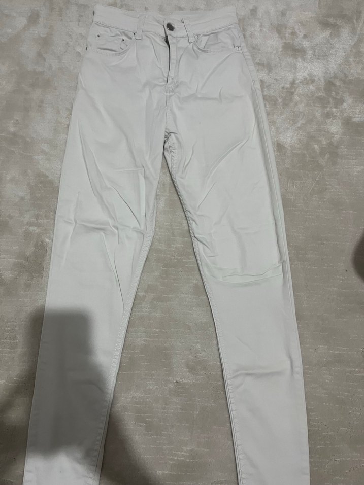 Yumuşak sentetik kumaştan yapılmış, normal boy beyaz kadın jean pantolon. Desensiz ve rahat kesimiyle gündelik sokak stilinde şık bir tercih.