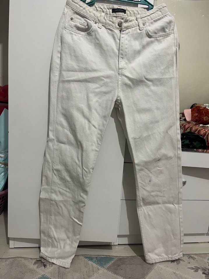 Beyaz pamuklu kot pantolon, normal kesim ve midi boyda. Günlük kullanıma uygun, rahat ve şık sokak stili için ideal. Lekesi var