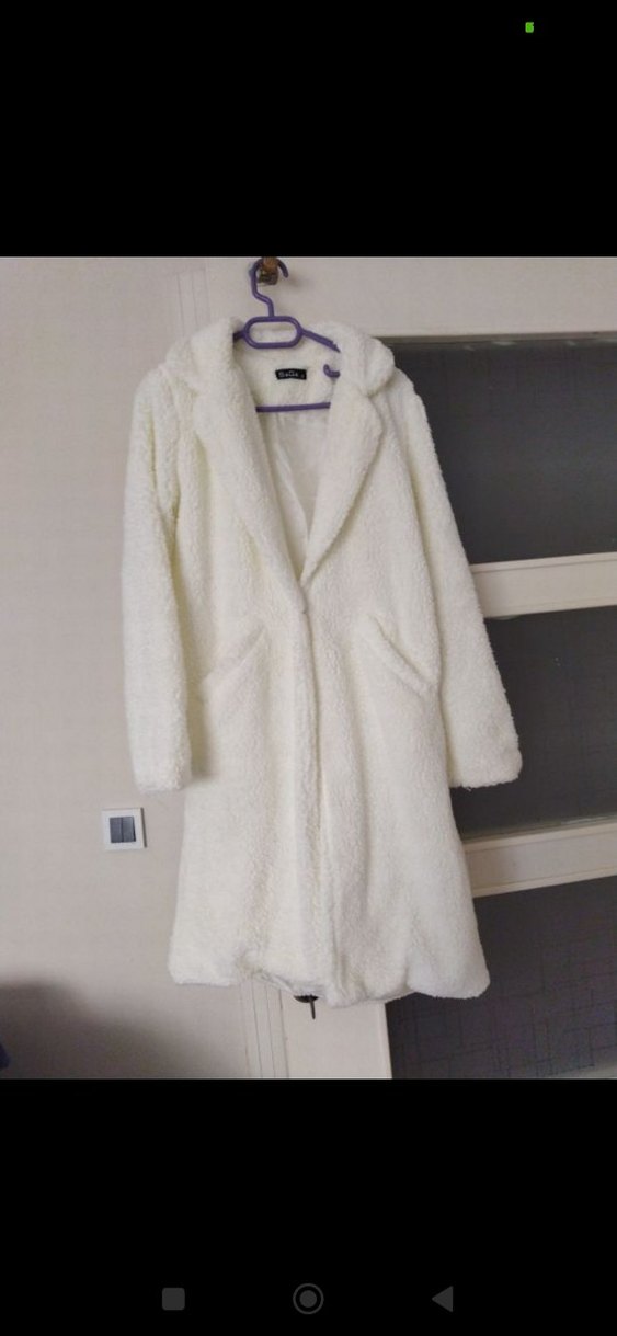 Beyaz, midi boy, kürk detaylı, uzun kollu, gevşek kesim ve sokak stili kadın kaban. Rahat ve gündelik kullanıma uygun. temiz urun rengi krem