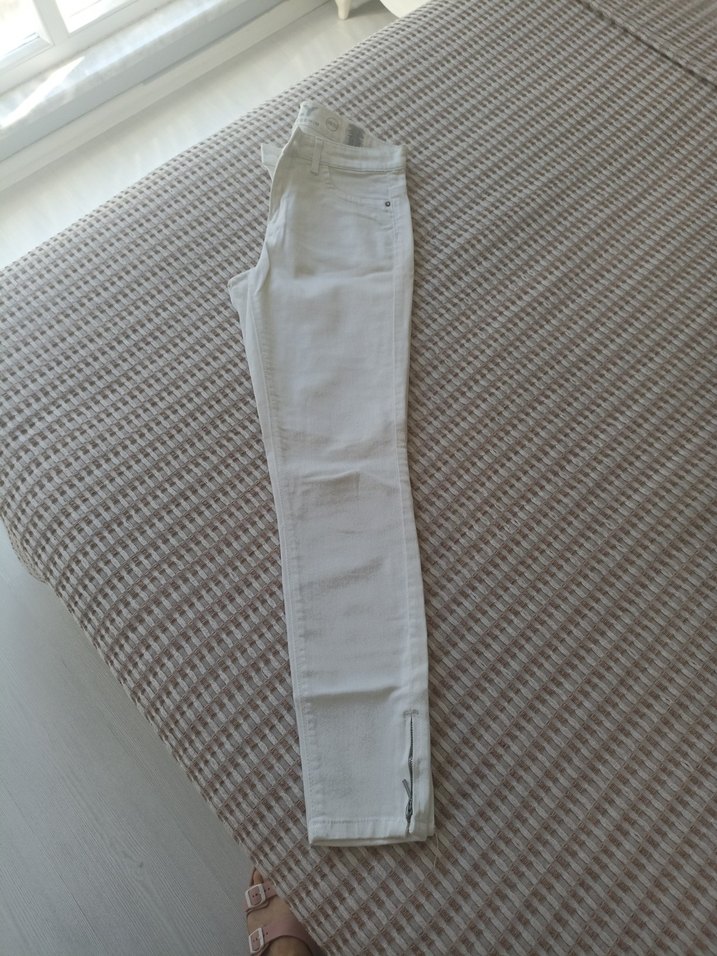 Pamuklu kumaştan beyaz midi boy regular fit kadın kot pantolon, fermuar detaylı. Günlük kullanıma uygun sade ve rahat stil.