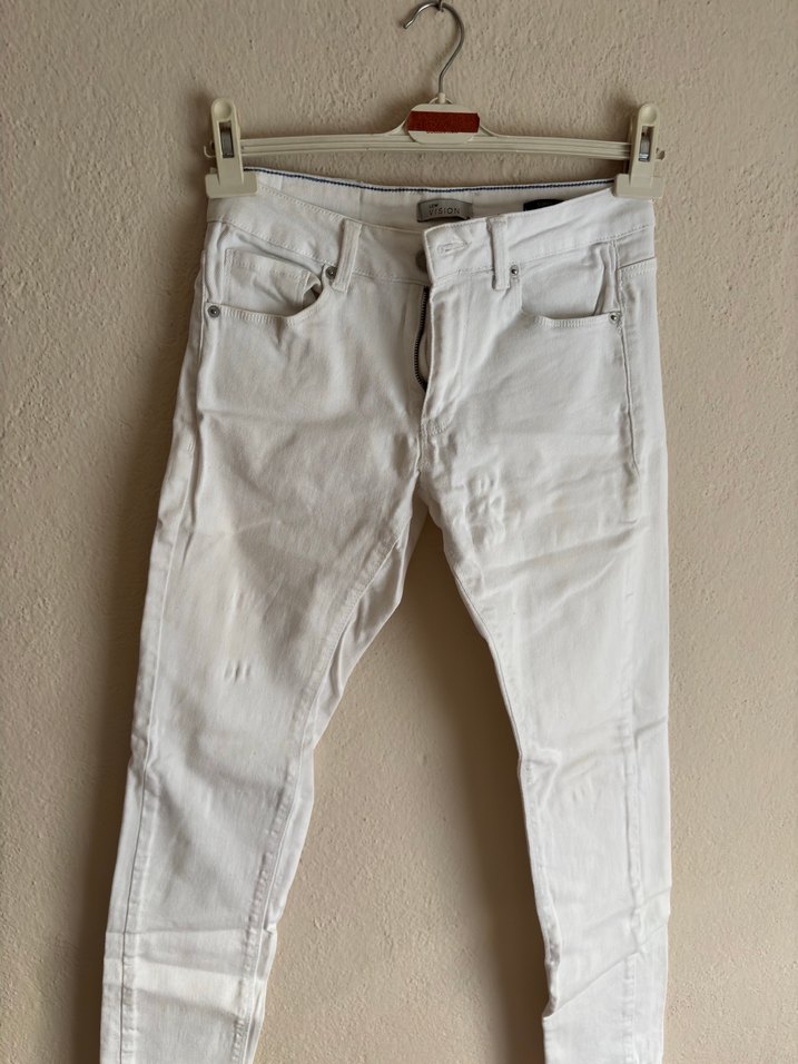 Beyaz keten kumaştan, midi boy ve regular fit kesime sahip kot pantolon. Günlük kullanım için uygun, desen içermeyen rahat ve şık bir tasarım.