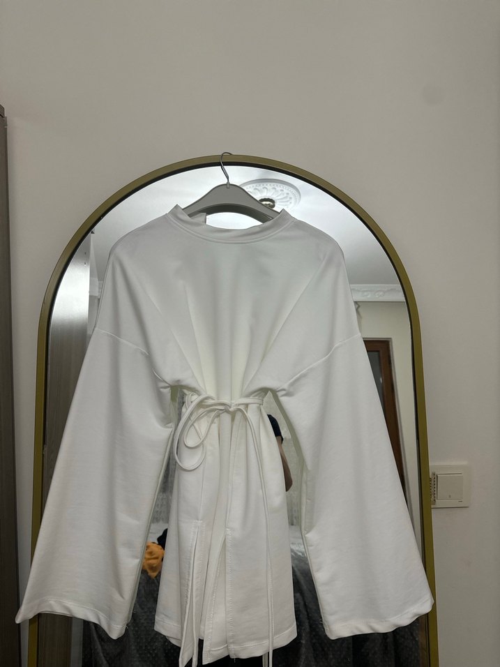 Beyaz, midi boy, uzun kollu, salaş kesim kadın body . Minimalist sokak stili ve belde bağcık detayı bulunur Kusursuz 1 dega giyildi .