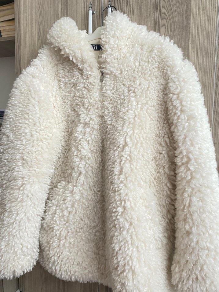 Beyaz midi boy, suni kürk detaylı mont, bol kesim ve uzun kollu. Yumuşak tüylü kumaştan, günlük rahat kullanıma uygun. Kürk