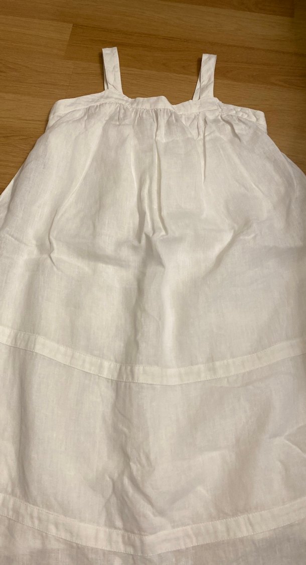 Gevşek kesim beyaz keten , fırfır detaylı, midi boyda, sade ve minimal bohem tarzda, günlük kullanım için uygun.