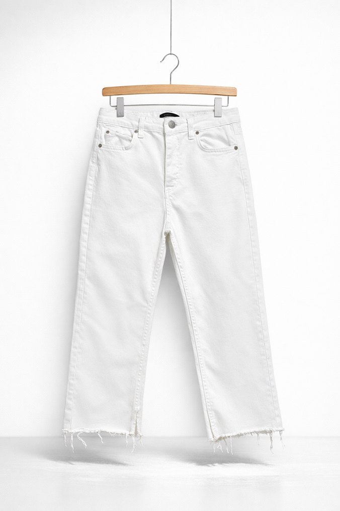 Beyaz renkte, normal kesim ve midi boyda denim jean. Minimalist tarzda, salaş uçlu ve gündelik kullanım için uygun.