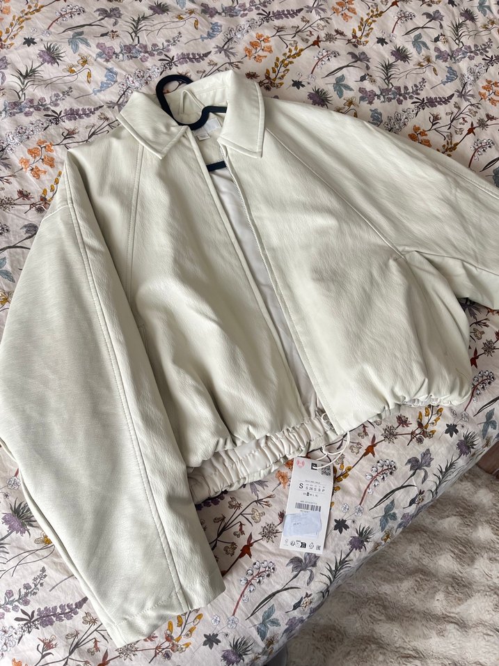 Beyaz deri ceket, yakalı ve fermuarlı ön tasarıma sahiptir. Uzun kollu, bol kesim ve midi boydadır. Hafif desenli ve elastik bel detaylıdır.