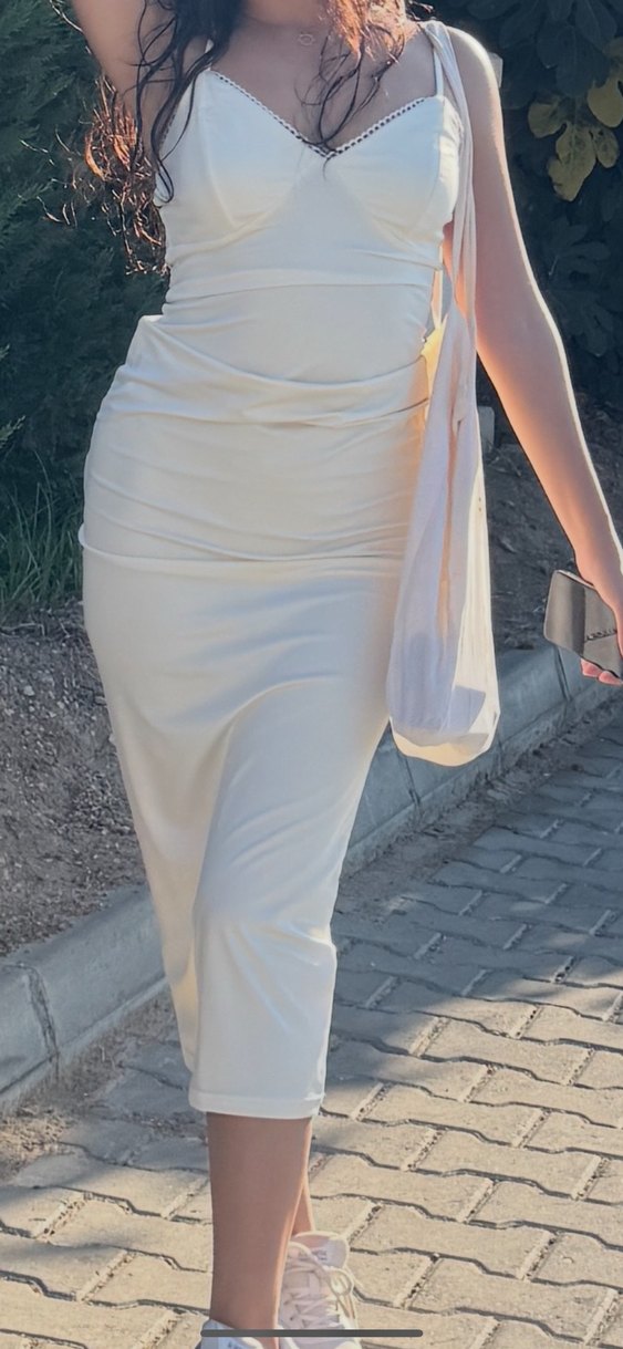 Beyaz, midi boy, drapeli ve straplez tasarımlı, ince dokulu elbisedir. Dış mekan sokak stili için uygundur.