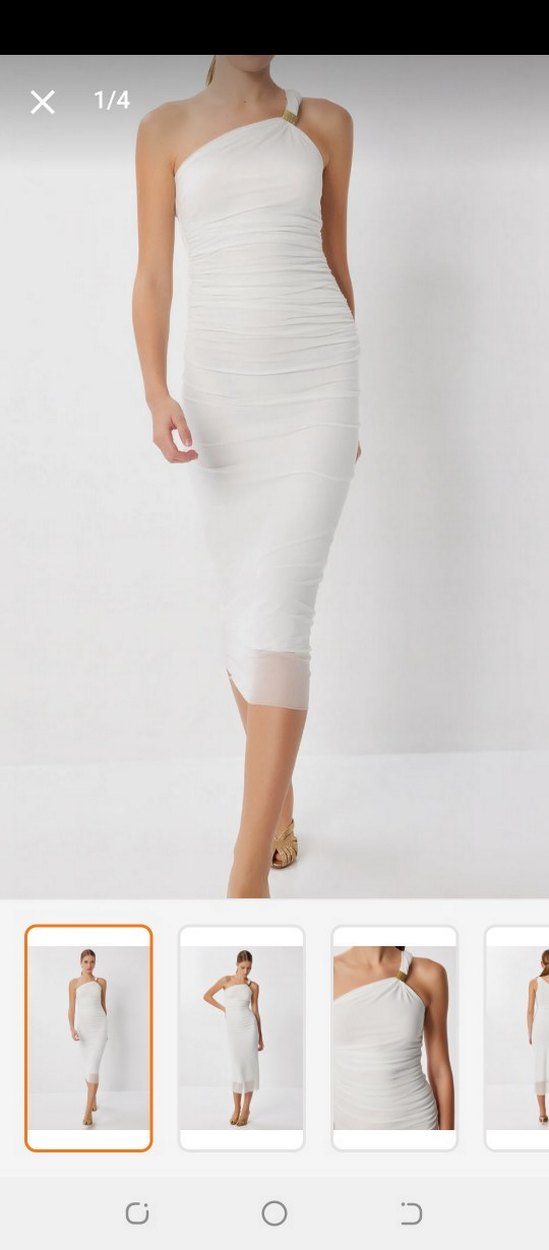Bu beyaz midi elbise, straplez yaka ve drapeli detaylara sahip, düz ve oturan kesimde. Düz sentetik kumaştan yapılmış, minimalist ve modern tarzıyla düğünlere uygun.
