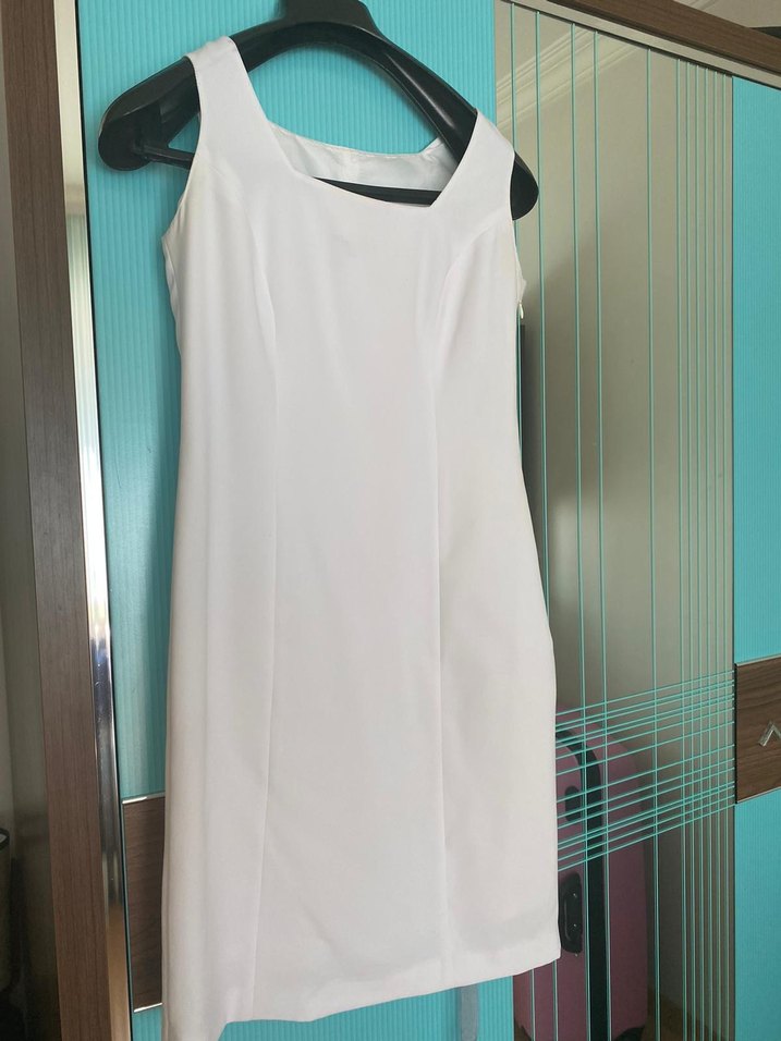 Beyaz, yakalı ve kolu olmayan midi elbise, minimalist tasarım ve rahat sentetik kumaştan yapılmıştır. Abiye elbise