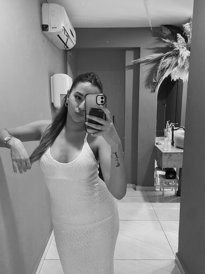 Beyaz, tasarıma sahip, vücuda oturan midi elbise. Minimalist ve günlük sokak stili için uygundur.