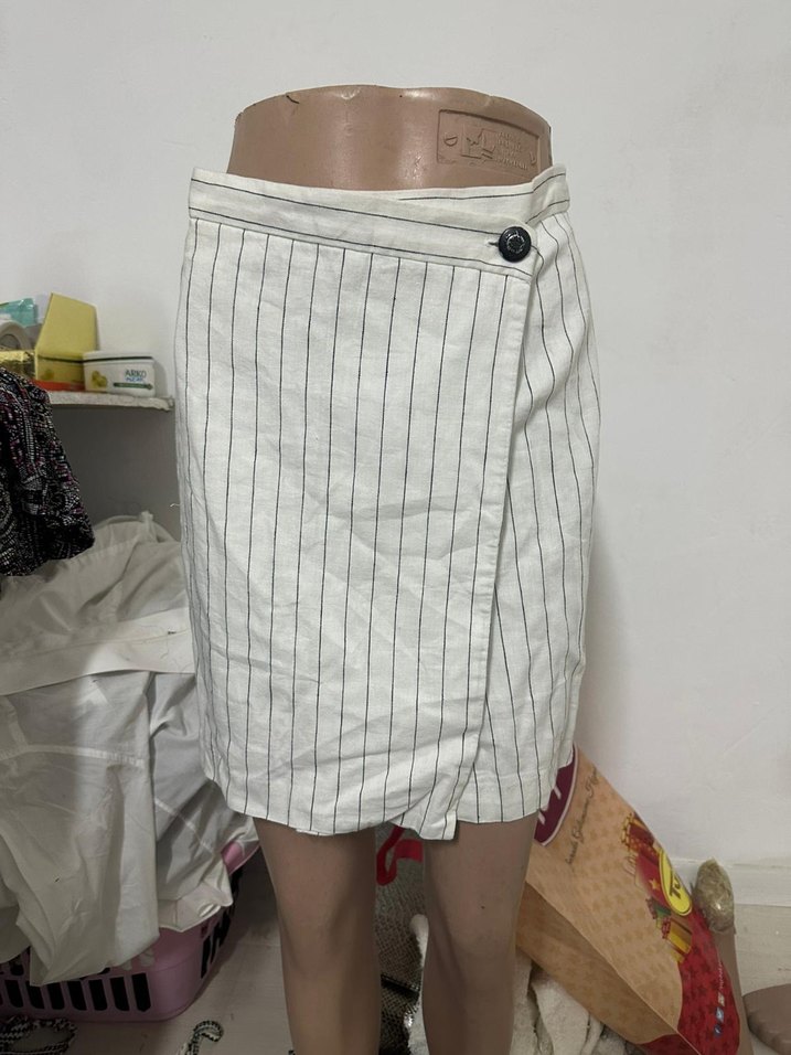 Düğmeli, çizgili beyaz midi etek, icindede düğme vardır komple etek acilabiliyor koton ürünüdür 36 bedendir