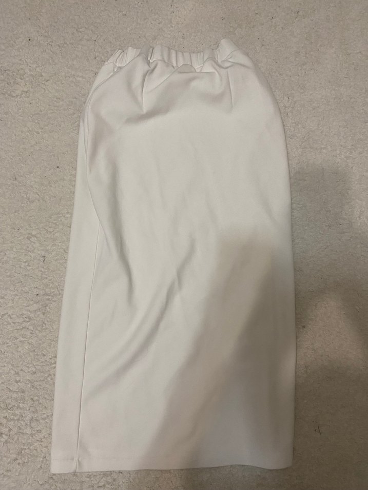 Beyaz, düz renk, sentetik kumaştan yapılmış, vücuda oturan midi eteği, minimalist ve günlük kullanıma uygun. 36 bedene uygun