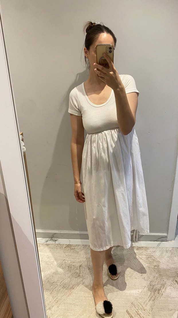 Beyaz midi elbisesi, kısa kollu ve yuvarlak yakalıdır. Yumuşak keten kumaştan üretilmiş, rahat ve şık bir gündelik kullanıma uygundur. Desensiz, Paris tarzı normcore tasarım.