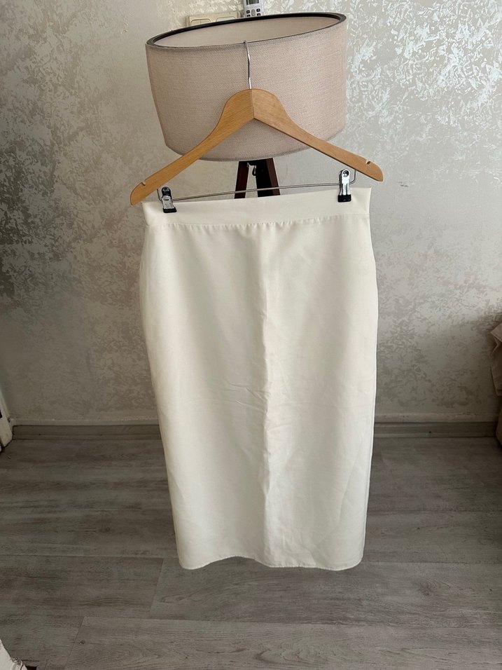 Beyaz midi hamile eteği, sentetik kumaştan, düz ve minimal bir tasarıma sahiptir. Ofis kullanımı için uygundur ve rahat bir kesime sahiptir.