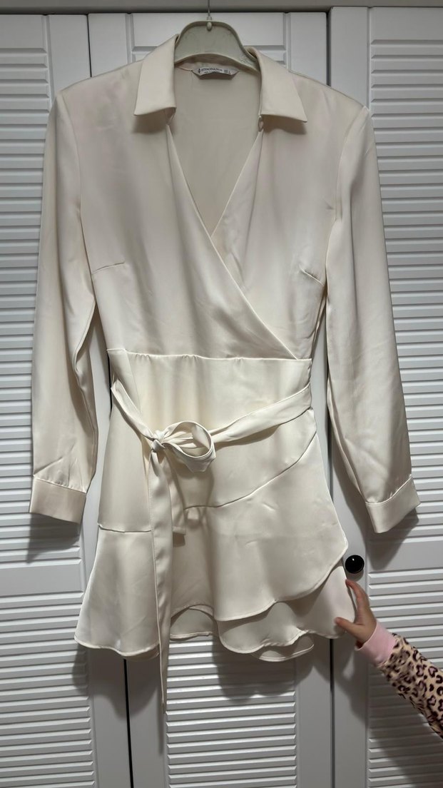 Uzun kollu, kuşaklı ve beli oturan beyaz midi elbise, sade ve şık Paris sokak modası tarzında.