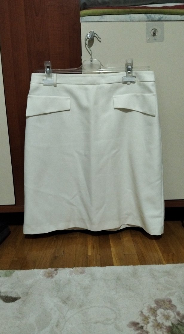 Beyaz midi kadın eteği, düz ve minimalist tasarıma sahip, sentetik kumaştan üretilmiştir. Ofis ve günlük sokak stili için uygundur. ✨