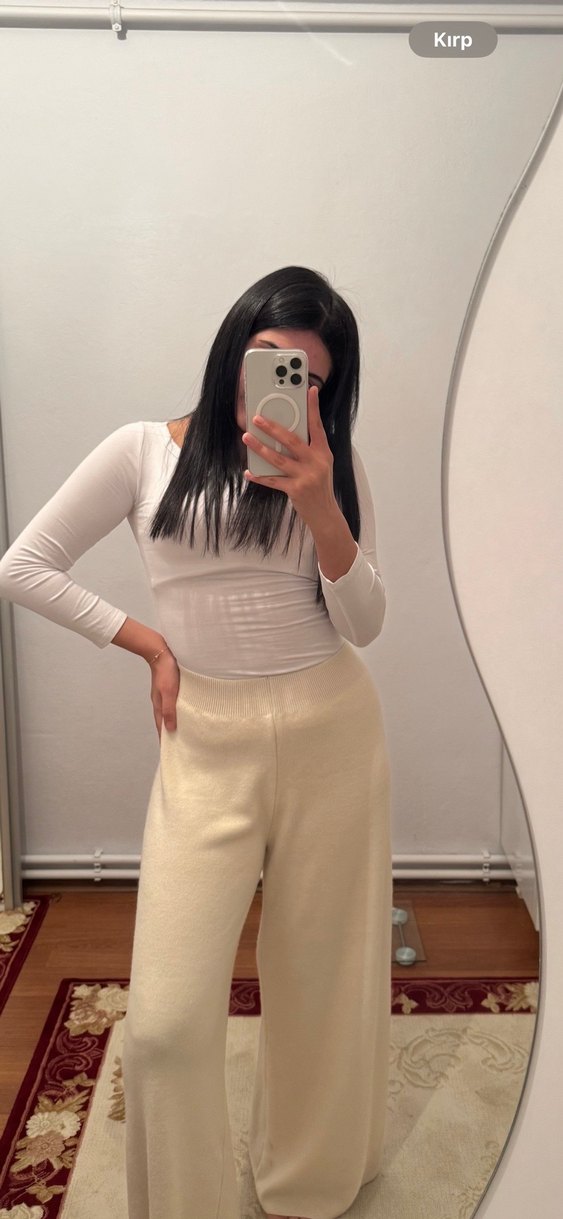 Beyaz midi uzunlukta, vücuda oturan ve ipeksi dokusuyla kadın ispanyol paça pantolon, günlük kullanıma uygun sade ve şık bir görünüm sunar Likralıdır.