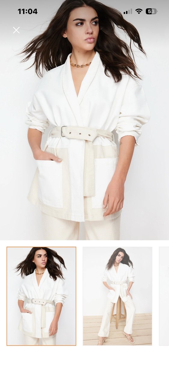 Kadınlar için beyaz renkli, midi boy, kemerli, minimalist ve çağdaş tarzda regular fit ceket. Askılı kollara ve desensiz tasarıma sahip.