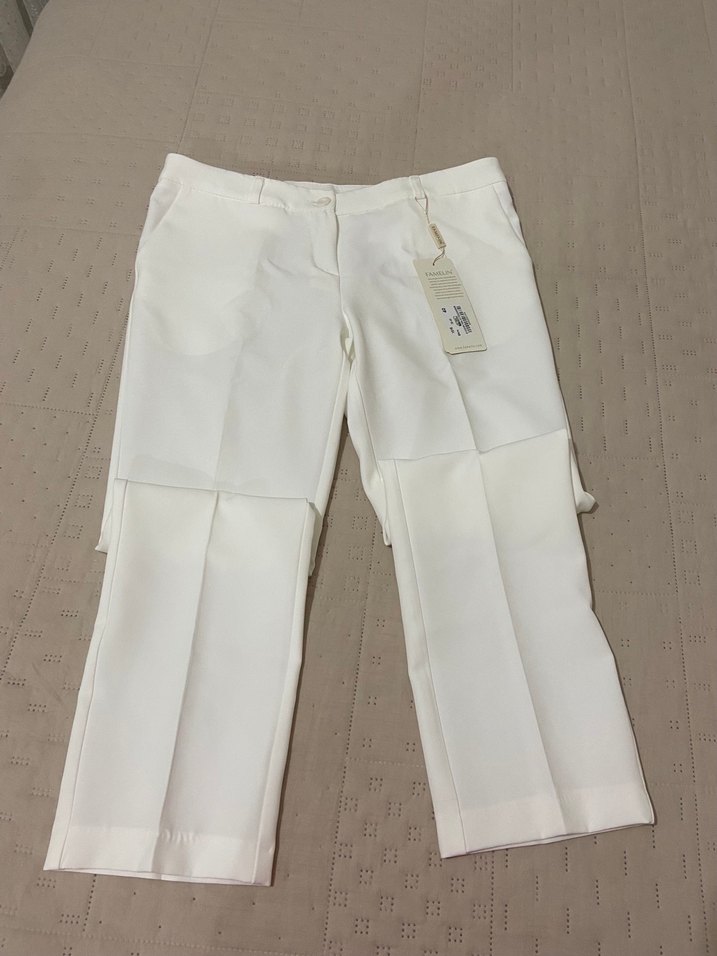 Beyaz keten kumaştan, regular fit ve kemerli midi uzunlukta kadın pantolon. Günlük ve rahat sokak stili için uygundur.