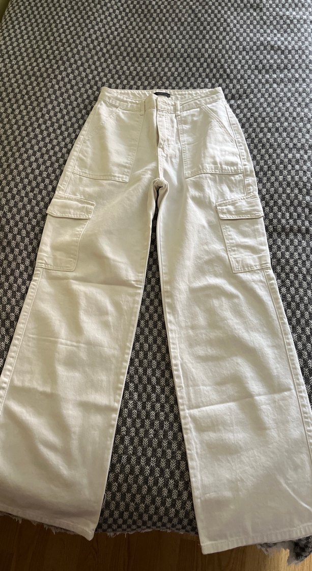 Beyaz midi uzunlukta, pamuklu kot pantolon. Geniş ön ve yan ceplerle rahat, gündelik sokak stili için uygun, zahmetsiz şıklık sunar Bel kısmının içi hafif sararmıştır
