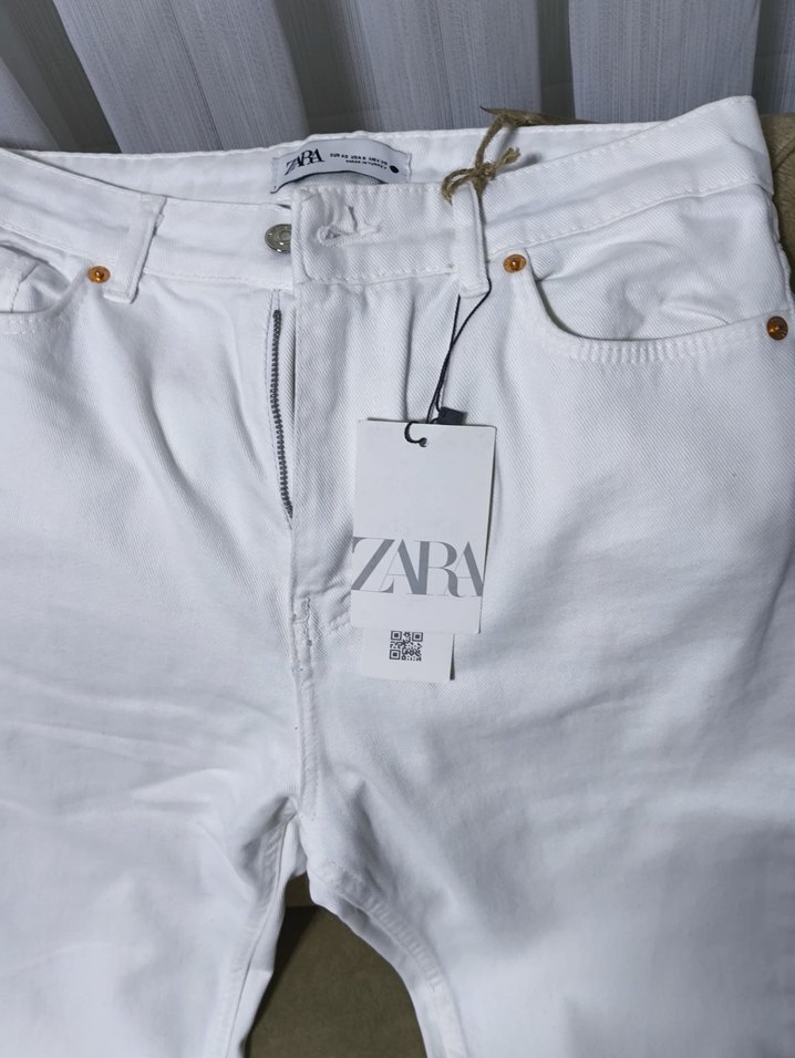 Pamuklu beyaz midi uzunlukta, fermuarlı ön detaylı regular fit kot pantolon. Günlük rahat sokak stili için uygundur. Marka: ZARA.