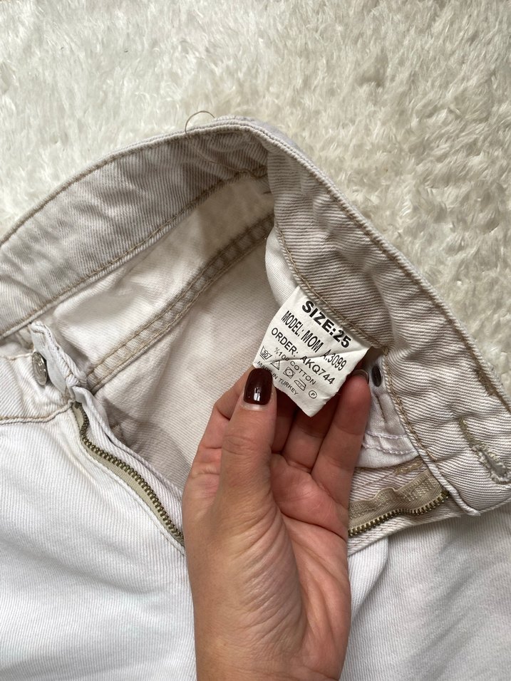Yumuşak pamuklu kumaştan, gri baskılı ve fermuarlı detaylı, fitted kesim beyaz midi kot pantolon. Günlük sokak stili için uygun, rahat bir model.