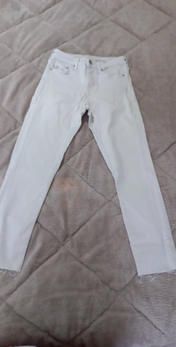 Beyaz pamuklu kot pantolon, midi boy ve regular fit. Günlük kullanıma uygun, desen içermeyen sade bir tasarıma sahip, zahmetsiz şıklık sunar.