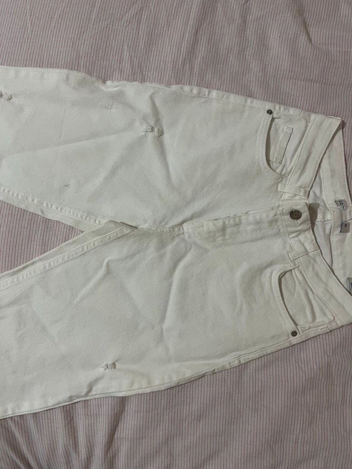 Pamuk kumaştan beyaz midi uzunlukta kadın kot pantolon. Düz, desen içermeyen, rahat kesimli ve minimalist normcore tarzda günlük kullanım için uygundur. Rahat ve şık.