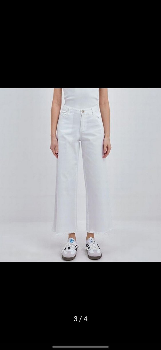 Pamuk kumaştan, rahat kesim beyaz midi uzunlukta kot pantolon. Günlük kullanıma uygun, zahmetsiz şıklık sunar.