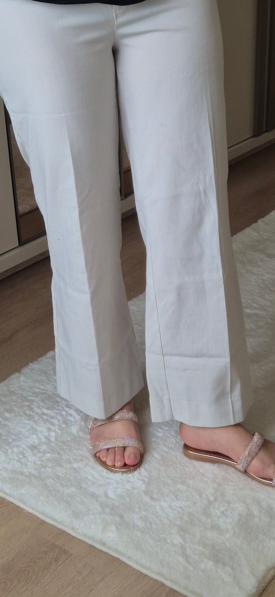 Beyaz, midi boy, düz kesim, kadın kumaş pantolon. Minimalist ve şık ofis stiline uygun, yumuşak dokulu.