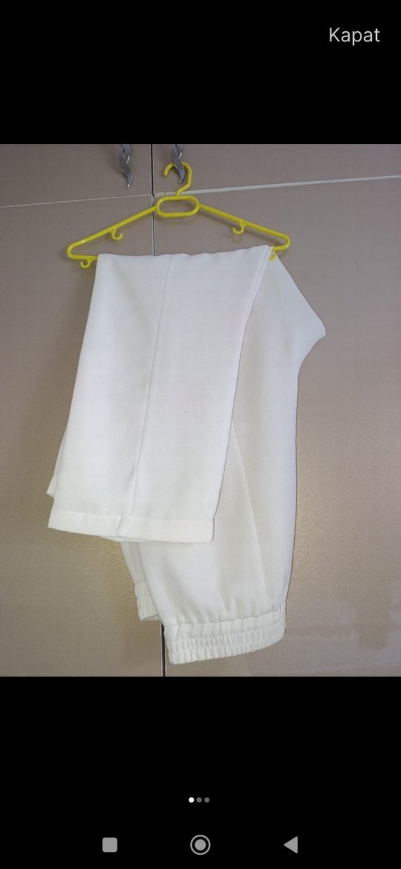 Beyaz midi uzunlukta, regular fit kadın pantolon. Yumuşak sentetik kumaştan, günlük sokak stiline uygun, zahmetsiz şıklık sunar.