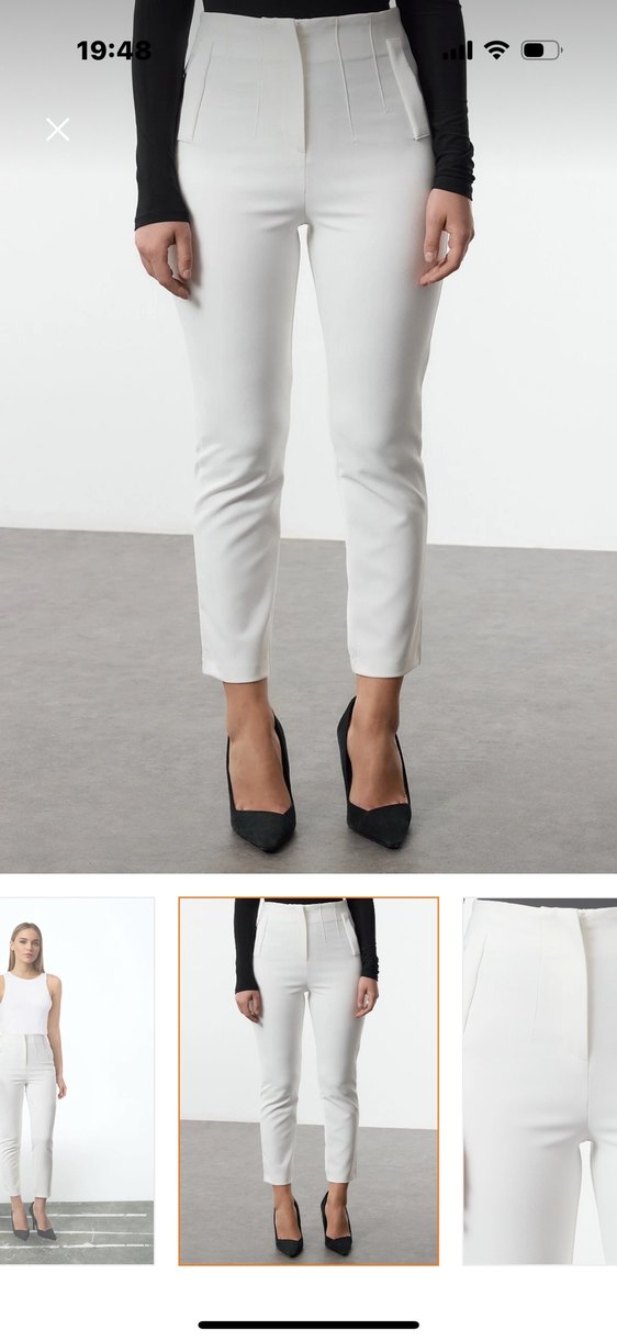 Beyaz midi boy kadın pantolon, normal kesim ve minimalist, çağdaş tarzda. Yumuşak ve pürüzsüz kumaştan, ofis için uygun. Zahmetsiz şıklık sunar.