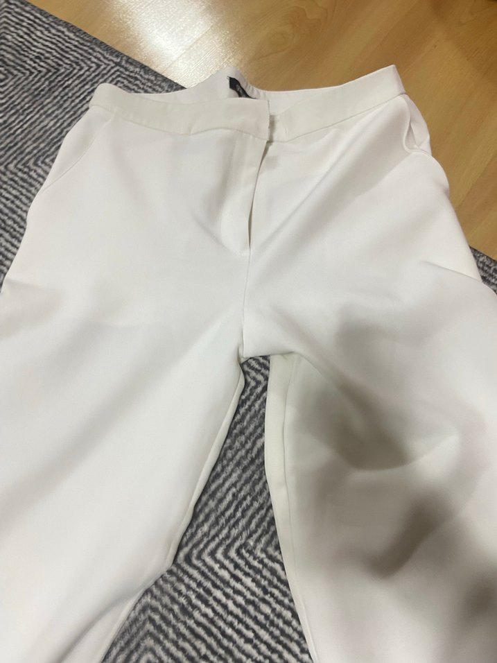 Düz beyaz, midi boy, rahat kesim kadın kumaş pantolon. Yumuşak sentetik kumaştan üretilmiş, günlük ve iş stiline uygun şık bir tasarım.
