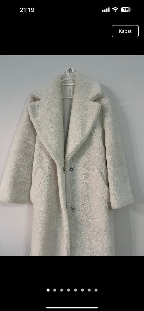 Bej renkli kadın kaban, kürk 38/40 bedenle uyumlu Işıktan kaynaklı rengi koyu çıkmış bej renktir
