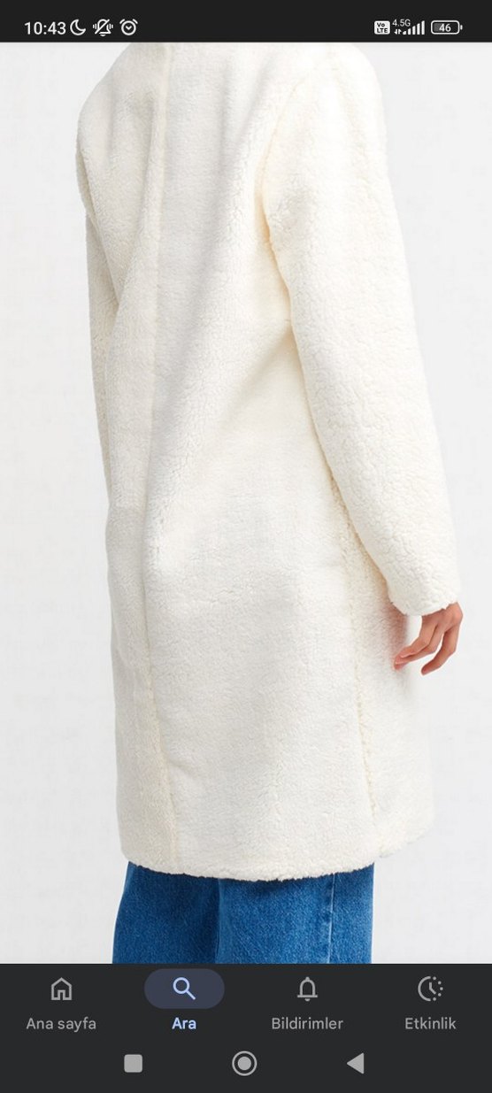 Beyaz midi kaban, kürk detaylı, uzun kollu ve kesik yaka ile. Yumuşak, sıcak kumaştan, düz ve rahat kesim. Günlük kullanıma uygun.