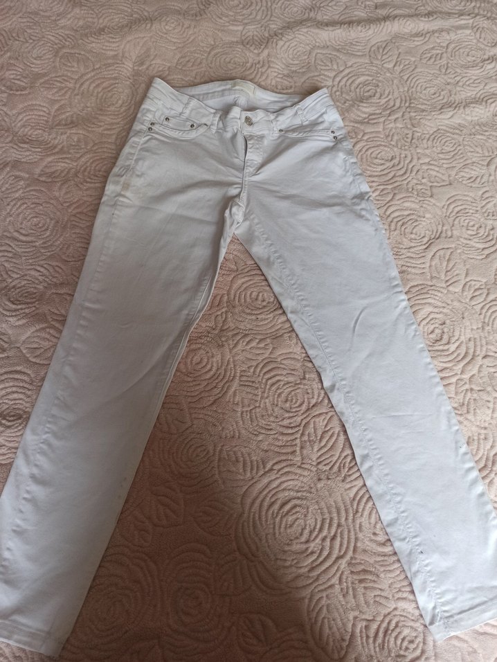 Kadınlar için beyaz kot kumaş pantolon, midi boy ve normal kesim. Günlük kullanım için rahat ve şık, sokak tarzına uygun.