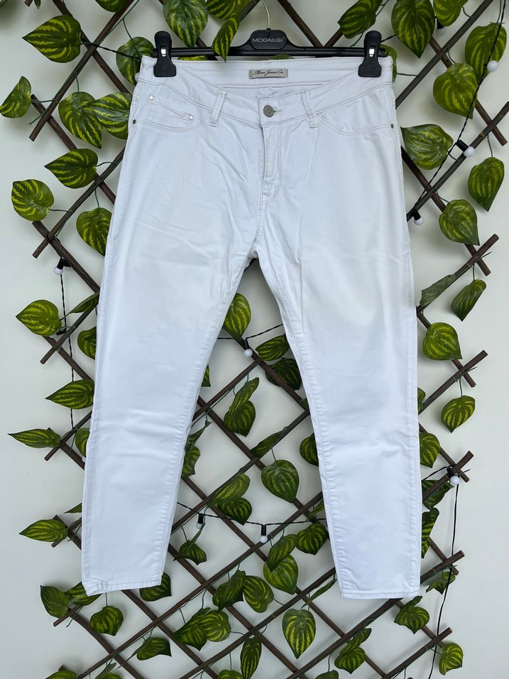 Beyaz pamuk kumaştan, midi boy ve regular fit kesim pantolon. Desensiz, rahat sokak stili için uygun, şık ve sade görünüm sağlar. İncelme tülerme yok ufak bi kusuru var