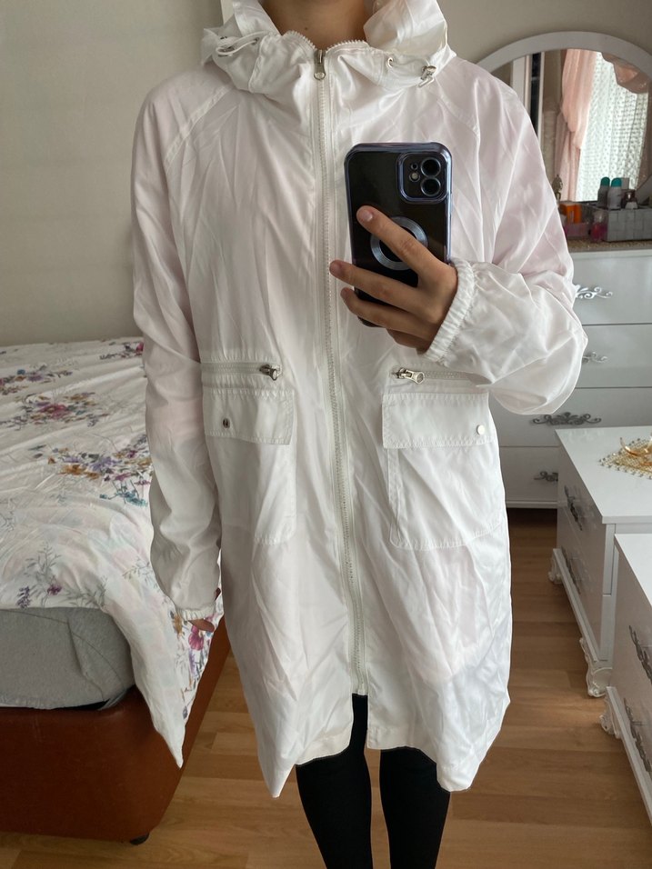 Beyaz renkte, yüksek yakalı, uzun kollu ve fermuarlı midi yağmurluk. Rahat kesimi ve sentetik kumaşıyla günlük sokak stili için uygundur. ️2 BEDEN