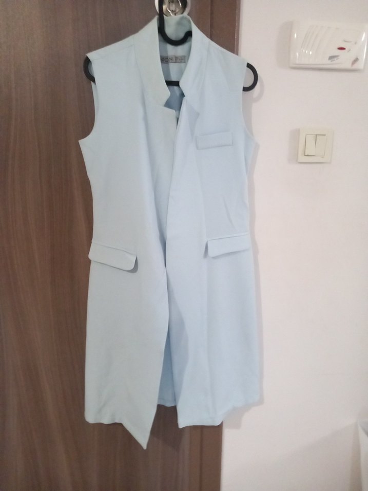 Beyaz, kolsuz, notlu yaka ve normal kesim midi yelek. Sentetik kumaştan olup minimalist ve şık bir görünüme sahiptir.